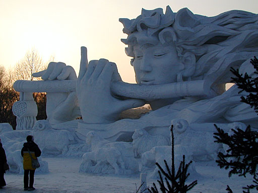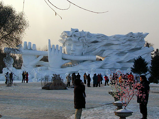 The temperature in Harbin reaches forty below zero, both Fahrenheit and centigrade, and stays below freezing nearly half the year. The city is actually further north than notoriously cold Vladivostok, Russia, just 300 miles away. So what does one do here every winter? Hold an outdoor festival, of course! Rather than suffer the cold, the residents of Harbin celebrate it, with an annual festival of snow and ice sculptures and competitions. This is the amazing sculpture made of snow greeting visitors to the snow festival in 2003.