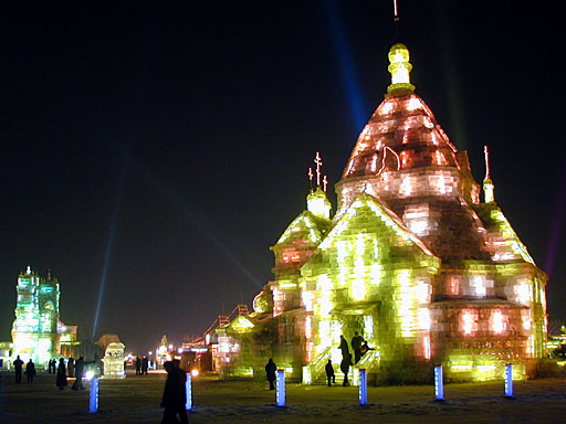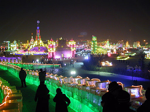 A view from atop that structure, looking back on a Russian-styled building and a mock Great Wall, both constructed out of ice. Making it to the top of this structure is an accomplishment in itself - imagine walking up a stairway of solid ice for two floors with no handrails. The yellow block wall on the right and the balconywork on the lower left are all ice, with no internal support structure - just lights.