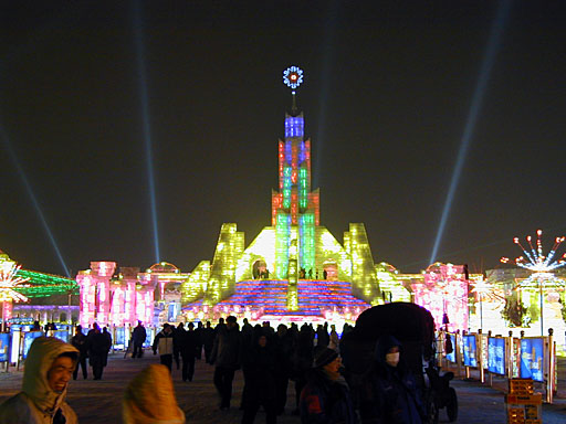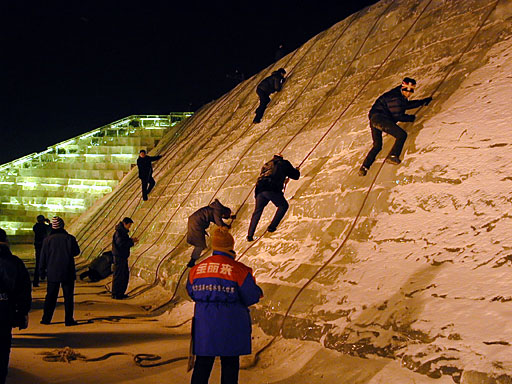 One of the popular activities at the festival is climbing a wall of solid ice. Amazingly, I didn't see a single person fall, and most everyone made it to the top. All the ice comes from Songhua Jiang, the nearby river, which provides a limitless supply; huge chainsaws are required to cut through the ice, which can be meters thick.