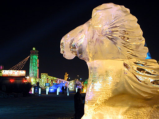 The snow festival is mostly a display of art; the ice festival is mostly a display of architecture. Nevertheless, a number of sculptures can be found at the ice festival, such as this life-sized horse. Agile youngsters with good balance climb atop the horses to have their pictures taken. Notice the layers of ice in the horse; blocks of ice are fused together to form larger blocks so that sculptures - or huge buildings - can be made.