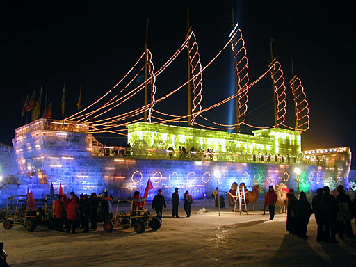 An entire ship constructed of ice, with passengers onboard. Though it might not be seaworthy, the ship would certainly float - after all, it's made of ice. Hundreds of years ago during the Manchu days of ice lantern art, the sculptures were lit only by candles.