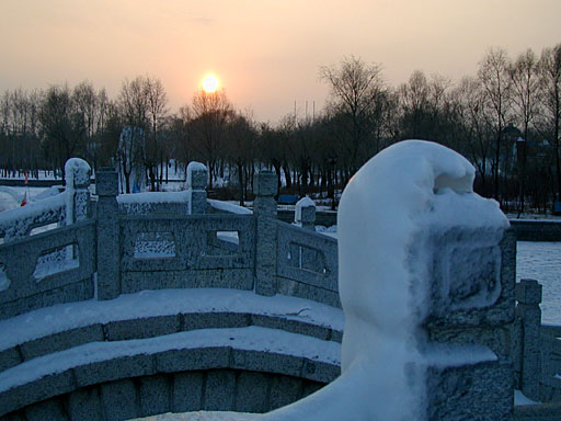 The sun begins to set behind the magnificent entryway sculpture. The snow festival is actually separate from the ice festival; both take place on the wide open spaces of Sun Island Park north of Harbin's river, Songhua Jiang. Harbin is situated south of the river, so it's a chilly ride over to the sites. It seems even chillier when crossing the bridge over the very wide and very frozen Songhua Jiang.